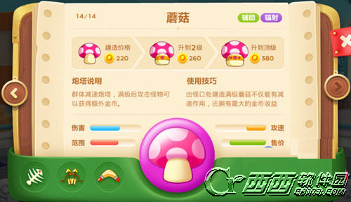 蘑菇是非常好用的一个炮塔,周围一圈的怪物都可以减速,攻击范围之广不是冰冻星或雪球可以比拟的。而且升到满级后攻击怪物可以获得金币,建议尽早建造。
