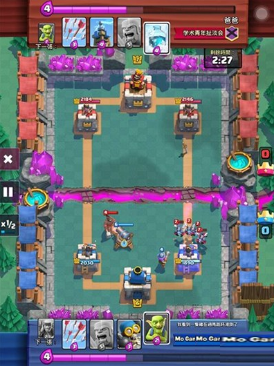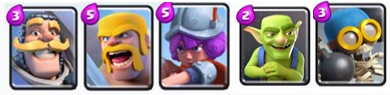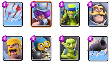 攻击面由骑士、野蛮人、火枪兵、掷矛哥布林与炸弹兵组成;建议以3费的骑士做为开场,后面布置火枪与炸弹兵,再视圣水情况补上野蛮人;掷矛哥布林的用处在于突袭削血,适合直接摆在河岸,但我通常会确认我的手牌里有其他对空的卡,才会用这样的战法。