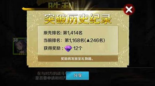 比武场天下争霸突破历史记录的钻石奖励,尤其是前两天获得奖励的玩家非常多。第一天玩过之后,从几万名打进几千名的话,就可以获得几百的钻石奖励了。