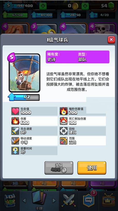 气球兵攻击建筑,可以下建筑物来吸引仇恨,保护塔,有地狱塔、电塔和哥布林小屋等,墓碑的话血太薄,起不到多大作用。地狱塔克制效果在建筑中算较好的,气球兵炸弹和最后附加伤害最多能削地狱塔一半多点血,之后还能帮助防守抵挡剩余伤害。5费换5费,还是比较平衡的。