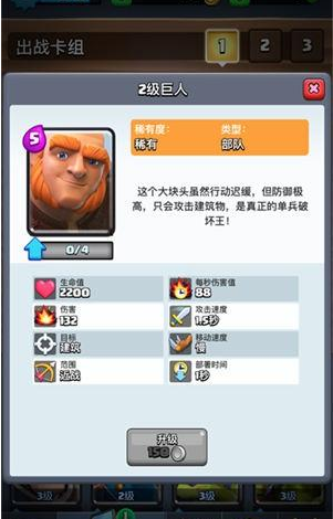 巨人这张卡牌是系统直接赠送的新手卡牌,但是性价比确是不错的。从名字就可以看出是一张MT,高达2000+的血量,有他在安全无忧。但是!这张卡牌的缺点也是特别明显:1.5费 2.不会攻击任何单位(除了建筑物)。一般出这张牌的时候,手里一般会有2个高输出单位,最好有下面这一张巨人的伙伴。
