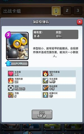 投弹兵这张卡牌也是系统直接赠送的新手卡牌,性价比一般,但配合小伙伴巨人却可以出奇效哦。投弹兵是一个远程脆皮的范围打击单位,但是血量只有150+,所以这张卡牌只能配合巨人进行战略部署。