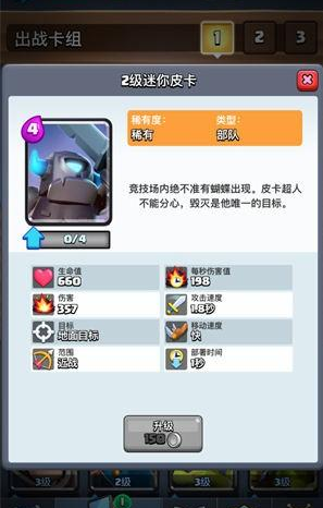 迷你皮卡这张卡牌是小编我开箱子出的,感觉入手容易,小编称他为巨人杀手。迷你皮卡拥有600+的血量,350+攻击力,秒伤达到190+,移动速度快,是小编认为新手期最好的突击兵种之一,打巨人和战略部署切脆皮有奇效哦。