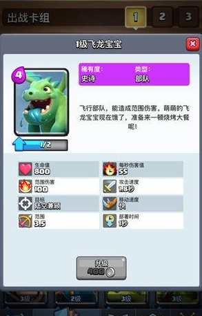 飞龙宝宝这张卡牌是小编红手闪现开出来的史诗级的卡牌,入手难度较高。飞龙宝宝拥有80+的血量,100+的范围伤害,打击面陆空兼顾,移动速度快,无视河道。这张卡牌属于飞行类的卡牌,如果不是射手类的卡牌是无法伤害到他的哦,这张卡牌的性价比高。