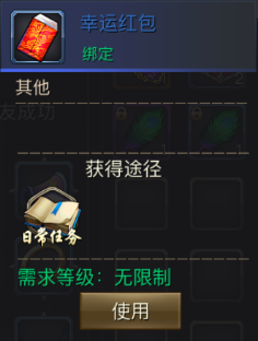 我们点击使用栏【红包】,点击幸运红包,就会有下图展示,玩家可以通过在日常任务中获得幸运红包,需求等级无限制。