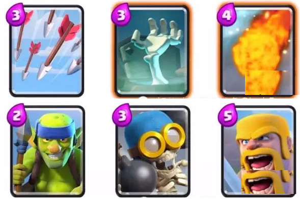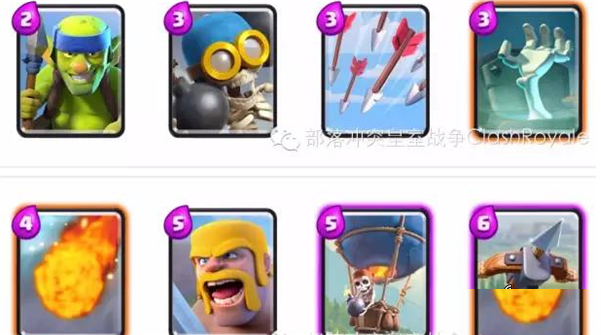 在防御类的卡牌推荐中,骷髅墓碑作为可以克制高爆发卡牌和肉盾卡牌都有不错的效果,所以是一张必不可少的核心卡牌;对于人海战术,投弹兵圣水消耗不高,可以在没有法师的时候替代法师,再配合万箭齐发可以克制血量低但已经聚堆的人海;对于建筑流,如果带火箭,圣水消耗比较高,可以考虑用4圣水的火球替代,同时火球可以在万箭齐发CD的时候用于替代,性价比高,也是推荐卡牌中的核心卡牌;最后对于进攻消耗类卡牌,哥布林投矛手和弓箭手可以2选1,而野蛮人在消耗战中,可攻可守,是一个多单位的半肉半输出,是一张必选卡牌,于是,我们可以确定好以下6张卡牌。
