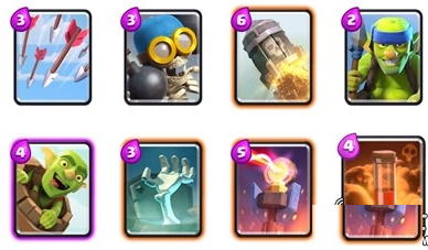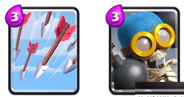 我的一选是箭雨+炸弹兵,其实这个上面的选择很多,换成法师可以对空,箭雨就能换电击,或者换成龙宝宝,但是法师相对太不灵活,容易被卡费,多余的2费完全是为了防空,除非遇上纯空军阵容,否则相对炸弹人优势不明朗;龙宝宝是一张攻防卡,攻击低血量高,在防守卡内战时会相对有用,可以裸下滚动手牌,但是环境中还是进攻卡组多,相对还是炸弹人好。加上新来的攻防卡,足以应付大多数对局。