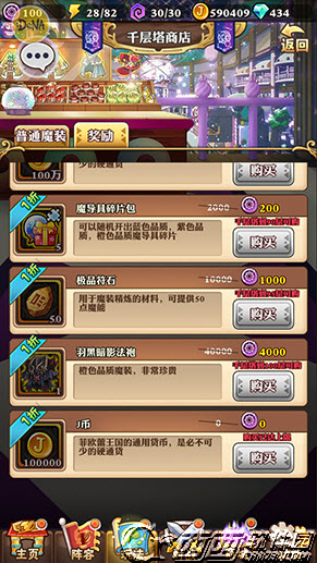 爬塔可获得技巧纹章或魔装,每成功挑战一层还可获得挑战宝箱的一次抽奖机会!爬的的层数越高能兑换的魔装当然就越高级,点击兑换就可进入用技巧纹章兑换魔装和魔装碎片的页面,极品橙装等着你哦!
