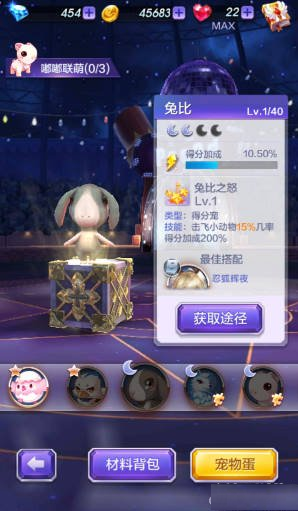 宠物的培养比角色的培养简单的多,玩家只要搞清楚升级兔比需要的材料,每天都去积累这些宠物材料和金币,很容易就能将兔比升满级了。