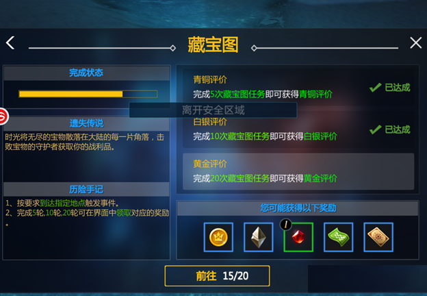 藏宝图任务是获得金币的主要任务之一了,藏宝图一天有20环任务,每环任务都能获得金币的奖励,并且每一环至少能获得500金币,累积起来就是一天最少1W金币。
