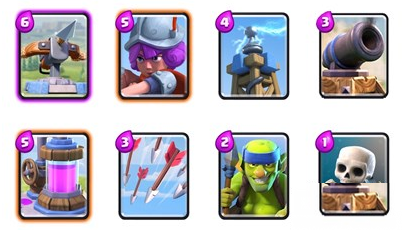 X弩卡组:Jerry这套X连弩卡组也是属于防守型卡组,首先利用圣水收集器和防御塔扩展圣水并稳固防守,不同的是这套牌的防御塔位置要更偏更前,以便防守X连弩。在防守稳固之后放下X连弩,利用特斯拉和加农炮这些低费的防守建筑配合骷髅哥布林等低费炮灰防守,为X连弩创造输出环境,可以直接打掉对手的防御塔。弱点是如果面对防御自闭流或者是召唤人海流这个思路稍显无力。