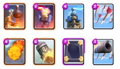 重要卡:地狱塔,水收集器,X连弩,迫击炮,万箭齐发,镜子