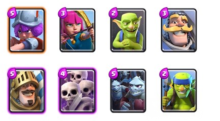 重要卡:苍蝇群,近战哥布林,骑士,弓箭手,火球,万箭齐发,女巫,皇子,火炮手,王子