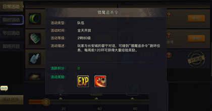 玩家达到2转80级之后,点击活动界面猎魔追杀令后的参与按钮,将会自动寻路到猎魔追杀令的任务接取NPC:婴宁处,接取任务即可开始获取经验和装备的愉快旅程了。