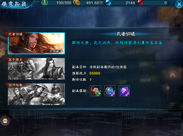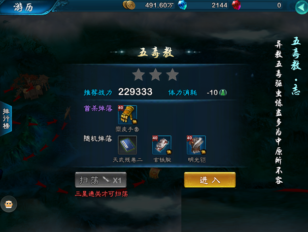 游历所推荐的战力与面板战力是差不多的,只要稍微高个2-3W战力就可以过关了,但是想要获得3星则十分的困难,需要高出将近1倍的战力才能从容拿到3星。