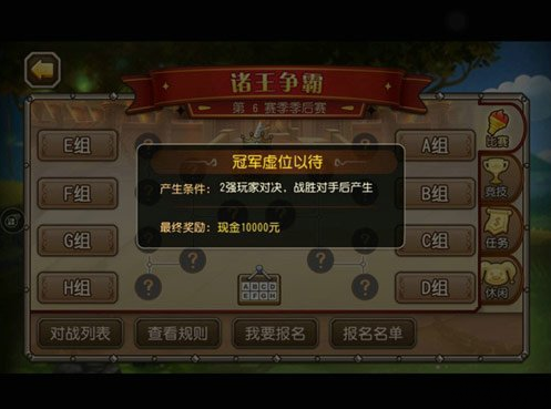 10级及以上的玩家可以支持自己喜欢的选手。如果自己支持的选手获胜可以获得一定的基础支持奖金,最高可获16倍基础奖金,还不快快来参加!比赛结束,冠军将获得10000元现金奖励,亚军获得2000元,四强选手可获的1000元现金大奖。