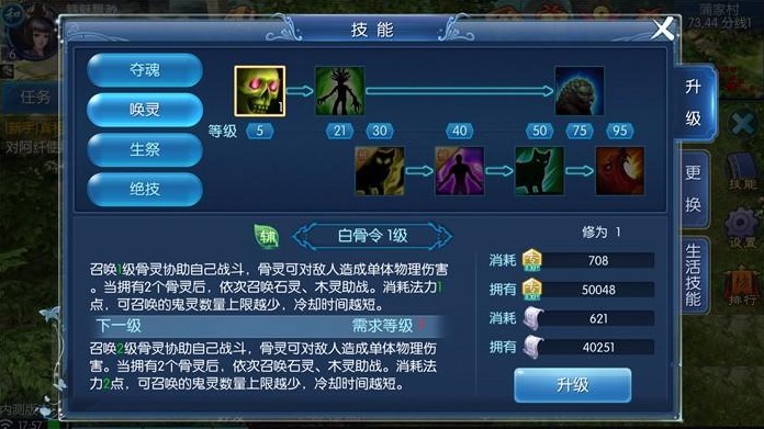 召唤木灵协助自己战斗,木灵可对敌人造成群体法术伤害。当拥有2个木灵后,一次召唤石灵、骨灵。可召唤的鬼灵数量上线越少,冷却时间越短。(前置技能:白骨令1级)