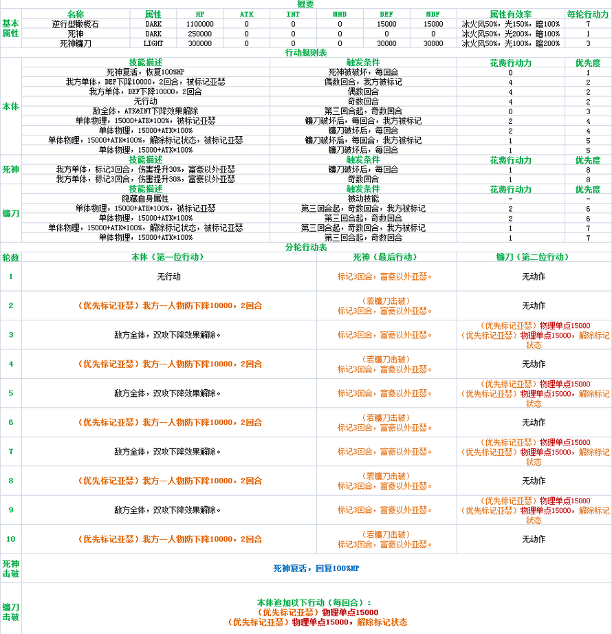 死神双防0,承受光属性伤害200%;本体双防15000,且承受光属性伤害仅有150%。所以在非AOE回合,光属性单刀请打死神。