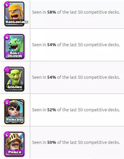 今天给大家带来皇室战争中近期使用率最高的卡牌数据,野蛮人 58%的使用率成为第一,幼龙和哥布林以54%的使用率并列第二,公主以52%的使用率成为第三。