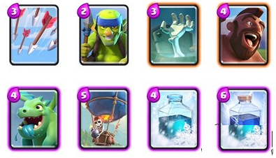 飞龙宝宝、气球兵、骷髅墓碑、冰冻法术、狂暴法术、箭雨、哥布林长矛手