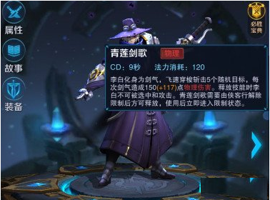 侠客行(被动): ——李白施展侠客行,连续(3秒内)的第四次普通攻击会触发侠客行,提升自身攻击力,并解除青莲剑歌的使用限制持续5秒。
