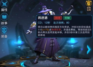 ——李白以醉剑势向指定方向突进,对经过的目标造成物理伤害,并造成晕眩,释放技能后5秒内再次启用发起冲锋,并在5秒内第三次启用回到原地。