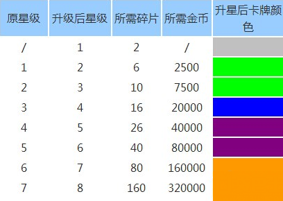 以上是卡牌升级所需碎片、金币以及卡牌颜色变化