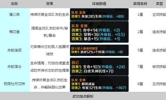 蒲公英的团队回血效果提供了强大的续航能力,主升技能,梅花香的团队被动加成也挺靠谱的,有点就加吧。