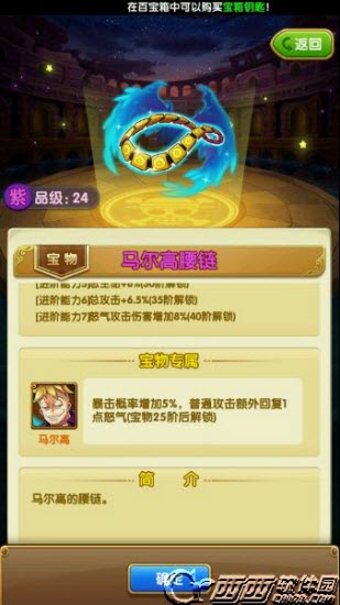 专属宝物技能:暴击率+5%,普通攻击额外回复1点怒气