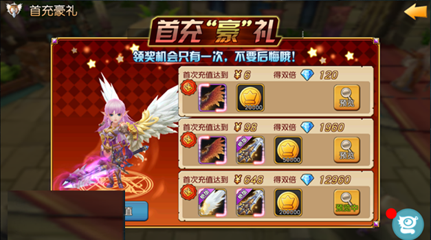 首冲648可以获得翅膀纯白圣光和绝版武器破晓巨剑。以及VIP5的所有特权和大量钻石。有这么多钻石基本在前期不愁吃穿了。该十连的十连,该重置副本的重置,该买体力的买体力。总之这么多钻石可以让我们安然的度过前期了。