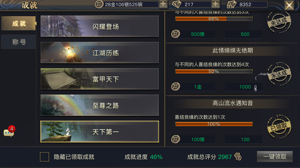 成就能领的,尽量去领,能提升些许战斗力。低则5,高则1000,越高获得难度越大。送花和收花的称号获得战斗力较低,可考虑不做。