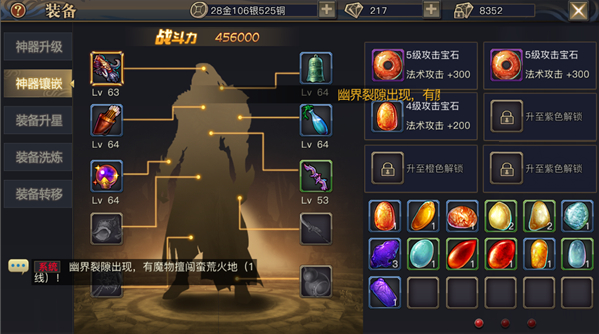 装备大家都比较清楚了,就是装备升级、神器镶嵌、装备升星、装备洗练、装备转移,通俗易懂,稍微玩下也可以懂了。
