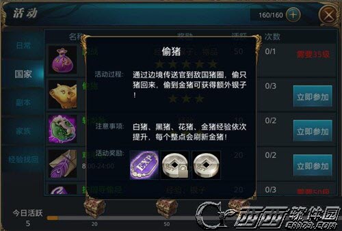 玩家们在完成了偷猪的主线后可以在本国的边境处找到NPC【边境猪倌】,NPC可以接取偷猪的人物,去别的敌国偷猪!可以获得大量的经验,玩家们千万不要错过!