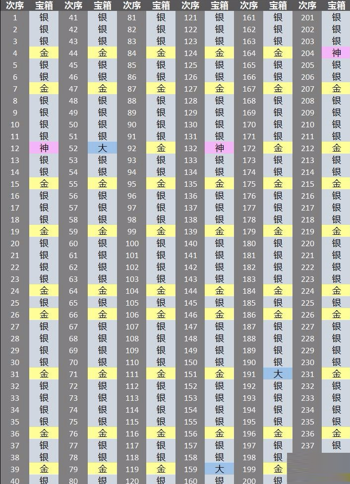 下列是竞技场等级获得的超级神奇宝箱所含的卡牌和金币等数目。