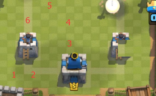 2号位置的原理和1号一样,不过因为很多玩家取下你的公主塔之后,随后进击国王塔,所以2号位要比1号位置危险。对方的闪电卡牌轰炸过来也会危及到塔,所以这个位置的使用需要注意对方有没有火箭和闪电,没的话可以用这个位置。