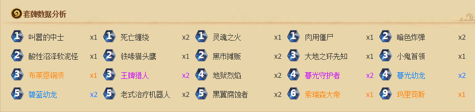 单卡选择1灵魂火:带一张斩杀解场均可,带2张确实卡手,感觉丢什么都亏亏哒。 1叫嚣:可以配合铜须,由于龙生物普遍攻低血多,叫嚣有时候可以做到良好的随从交换,当然还有终极COMBO叫嚣王牌! 1肉僵:其实本来是双肉僵的,不过当时我觉得环境有很多战士和骑士,所以去掉一个僵尸换了小软,再就是后期抽到肉僵真的很想报警(抽小软至少比肉僵好) 2王牌:此卡组严重缺乏解大怪能力,而且如今PP佛祖横行,带2个王牌完全可以,有时候还能叫嚣王牌解个大帝战争古树什么的,想想都过瘾。 1大地环1小鬼首领:带了一个3费战吼的奶可以奶怪也可以配合铜须,小鬼首领打骑士或者动物园非常好用。 1猫头鹰:不带沉默总感觉不舒服,带一张不错。 2黑翼腐蚀者:5费小火爹,赚卡能力及强,缺点是打快攻有点尴尬。 2黑市摊贩:这张牌实在是太强了,主要是术士的1费基本都是好牌,中立1费较好的可能只有叫嚣了,持盾卫士勉强还行。