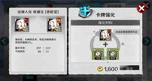 作为拳师,秋湘玉的强化材料主要是绿色的强筋刚法,与剑士所用相同。用到这个强化材料的卡牌较多,秋湘玉作为B资质拳师,可以考虑强化到+1,+2即可。
