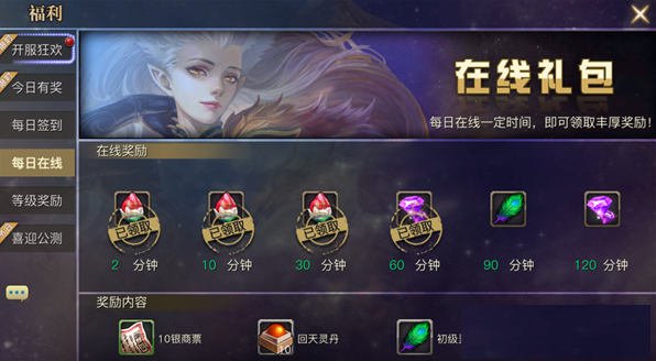 每天登录游戏,并保持在线时间达到2分钟、10分钟、30分钟、60分钟、90分钟、120分钟时,都可领取到对应的一份奖励;