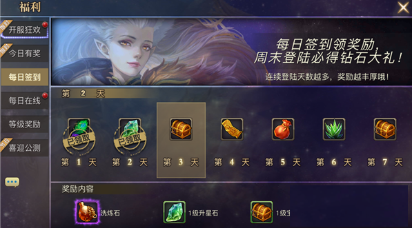 每日登录游戏,即可前往“每日签到”面板领取签到奖励,连续登录天数越多,能够领取到的奖励也越多。