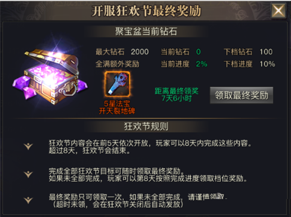 随着玩家每天的游戏进度,活动会累积一个终极奖励,在活动结束前都可以领取,终极奖励包括钻石、5星法宝等,建议玩家将狂欢节的进度累积100%之后再领取该奖励,这样可领取到满档大奖;