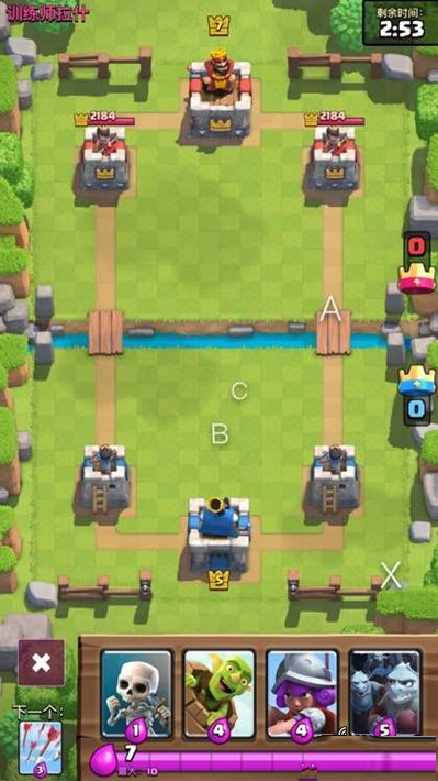 黄毛,小骷髅,炸弹人,这三个已经确定了,然而小骷髅不足以耗死高威胁的王子,所以还得加个刺刀哥布林,骗取对面攻击,低费解场后,接下来就是反攻了,再加入反攻的卡,可以是王子,野猪骑士,亦或是胖子,这么一来我们就有了五张卡。这五张卡就算是这套牌的核心,就是骗!以小攻势骗取对面大攻势,然后以低费解掉,用赚取的圣水差,来一波对面难以抵挡的进军。接着我们要做的就是完善他,一套牌的强度如何?很大程度取决于他的可操控性。