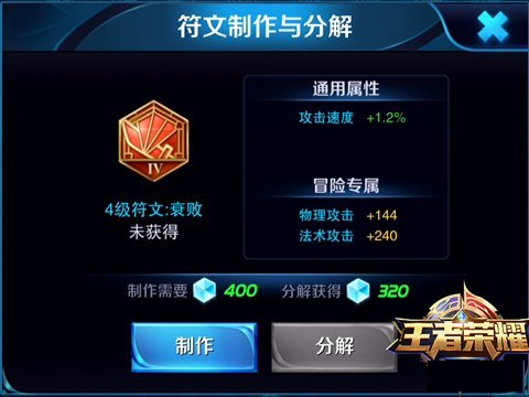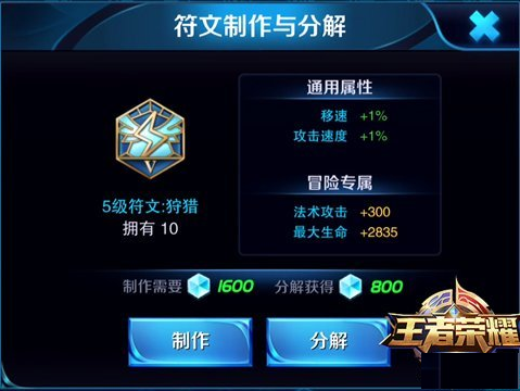 符文分解与制造,众所周知,咱们这个游戏的符文是可以分解获得符文碎片的,制造相应的符文也需要相应个数的符文碎片。那么问题就来了,我获取符文的方式很单一,符文碎片就更不用说了。其实我这里也并没有什么办法,只能跟你们说耐心的攒。因为这是人家公司获取收入的一个来源。都想要5级符文就需要攒够1600个符文碎片来制造。而分解一个5级符文只会有800个符文碎片,所以没事儿一定别手欠。(想分手的可以试试)