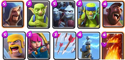 1)万箭齐发:万箭齐发(简称箭雨)在任何竞技场等级都是一张炙手可热的优秀卡牌。仅仅3费的圣水消耗,使用得当几乎一定可以赚费。它广阔的杀伤半径可以保证一次性伤害到多个单位或建筑。想象一下对面的长矛哥布林和苍蝇群被一张箭雨轻松解掉的场景,瞬间就拉开了4费的圣水差。在天梯对战中箭雨赚费的场景屡见不鲜,也就不奇怪为什么箭雨一直都是所有竞技场的热门卡了。
