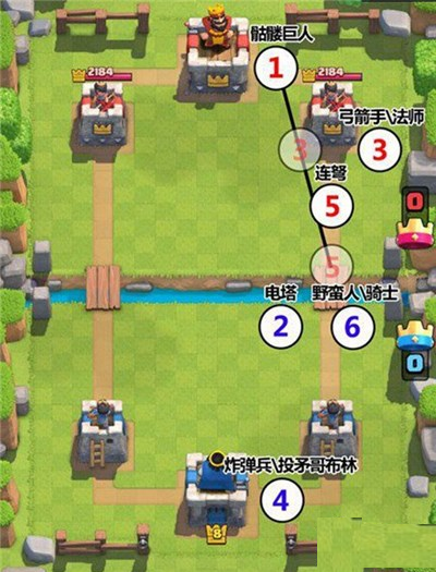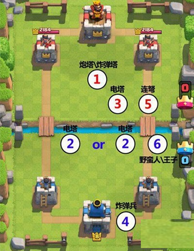 A.底线放骷髅巨人(这时候就已经要警惕了,手上没火箭没肉随从的,赶紧过牌),当骷髅走近河道时,他们就会在后面放连弩外带其它小兵,你这时候放的兵大部分都会被骷髅巨人留下的炸弹炸死。怎么办?在对手下骷髅巨人后迅速部署防御设施,防止对手在连弩附近架设其它建筑,就算最后对手不下连弩,这个防御设施也可以起到防御骷髅巨人的作用,具体步骤看下图。