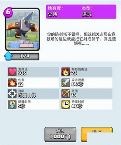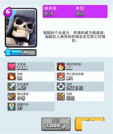 2阶竞技场出现的一张紫卡,有着比较优秀的血量和攻击力,死亡后原地掉落一枚炸弹,能造成约莫1000点伤害,这个威力无论对近卫塔还是对我方随从都非常致命。