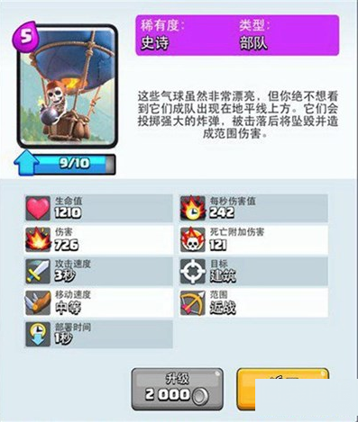 2阶竞技场的另一张紫卡,拥有极高的攻击力,放着不管的话,甚至能炸毁基地,死亡后同样会在原地掉落一枚炸弹,但只能造成约莫100点伤害。解法很简单,卡组里必须有对空单位,2张或以上,看到气球兵后果断放出即可,跟哥布林飞桶一样,属于只要有所准备,根本不是威胁的一张紫卡。