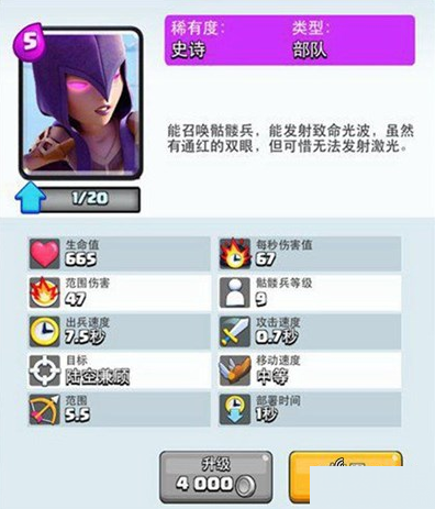 新手阶段第三张紫卡,攻击带溅射,每隔7.5秒施放出3个小骷髅,带线好手,对付低生命值多单位的随从时,效果相当不错。