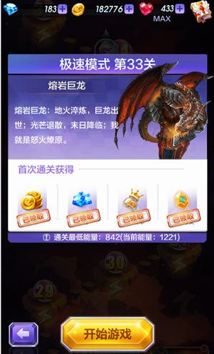 推荐理由:极速模式第33关是BOSS关卡,我们的通关目标是击杀第33关BOSS熔岩巨龙,所以加分的宠物对于通关来说并没任何帮助,而绿野仙踪的技能可以复活,可以让人物的续航能力提高。因为本关是BOSS关卡,人物的技能无法发挥出来,本关关卡不为大家推荐人物以及滑翔伞。
