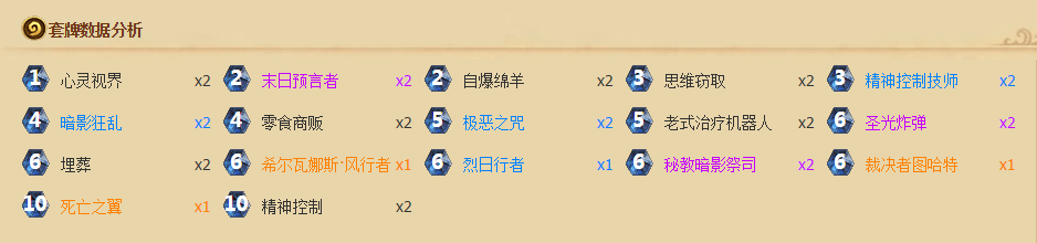 AOE体系包括两张末日预言者、两张自爆绵羊、两张极恶之咒、两张圣光炸弹还有一张掀桌子--死亡之翼,一共9个aoe。