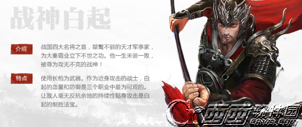 作为近身攻击的战士,白起的血量和防御是三个职业中最为可观的。让敌人毫无反抗余地的持续性贴身攻击是白起的制胜法宝。以长枪作为武器的他,一点寒芒先到,随后枪出如龙!